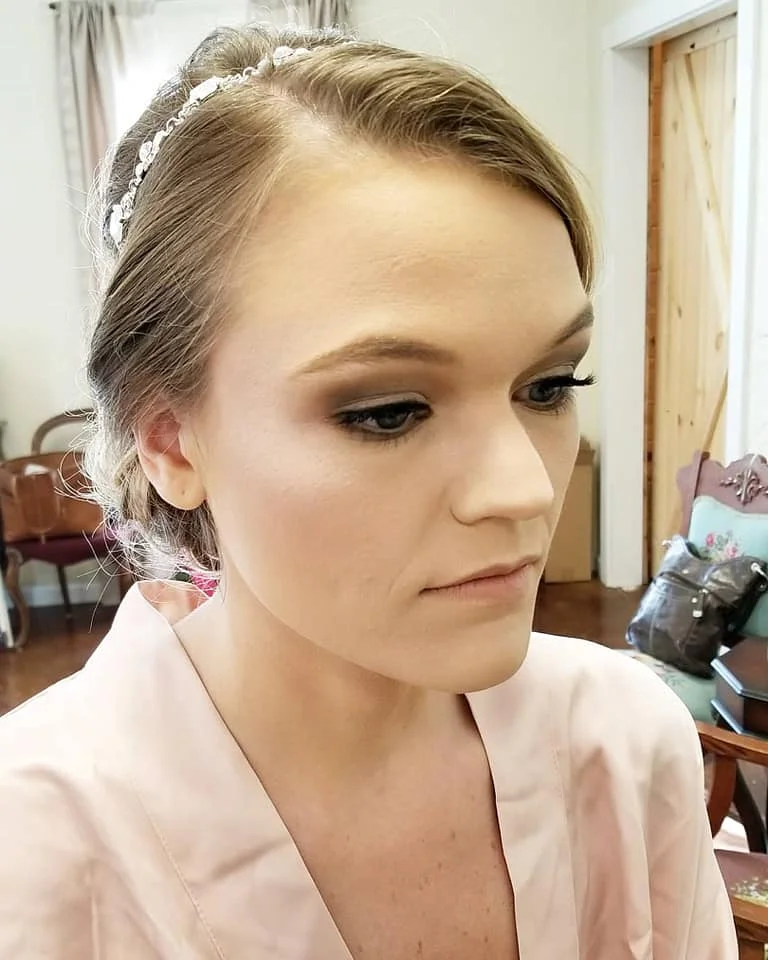 I worked with different shades of gray and brown for her eyes. We started with a light brown for her transition shade then layered darker browns and grays on top. I added some white shimmer on her lid and a bright sparkling white on her inner corner and brow bone! She was stunning. DO NOT forget the bottom lash line! It is a subtle but strong way to make your eyes pop.
